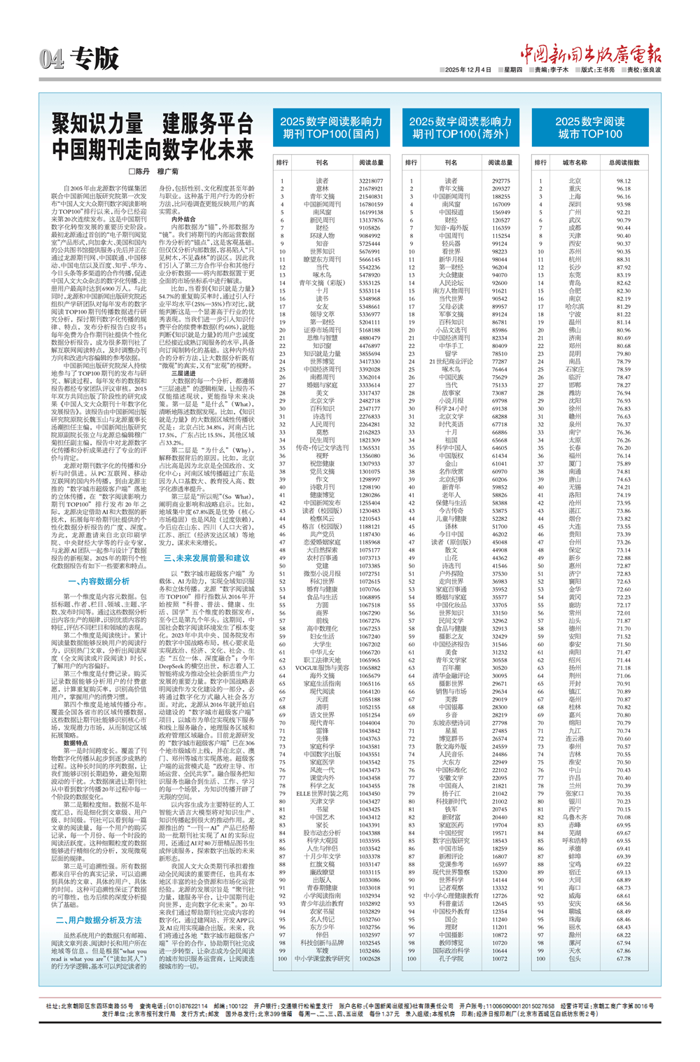 活动现场重磅发布 “2025数字阅读影响力TOP100期刊(国内)”“2025数字阅读影响力TOP100 期刊(海外)” 两项核心榜单,同步揭晓的 “2025数字阅读TOP100城市” 榜单,已于12月4日发行的《中国新闻出版广电报》专版报道。