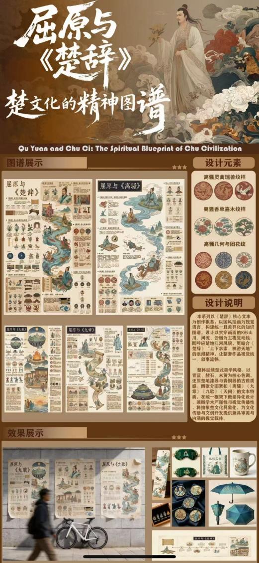此外,团队完成 \\“楚韵新绎” 项目专属 LOGO 设计 \\,以楚文化图腾、香草意象、数字线条为核心元素,形成统一、鲜明的品牌视觉符号,强化项目辨识度与传播力。