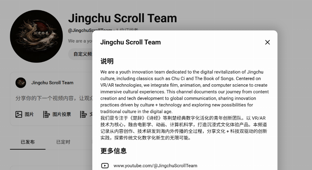 为推动中华优秀传统文化出海,项目团队已正式开通YouTube、TikTok两大海外社交媒体账号,搭建楚辞文化国际传播窗口。账号以 AI 漫剧短片、知识图谱图解、楚地文化科普为核心内容,适配海外青年短视频消费习惯,用视觉化、故事化表达打破文化壁垒,向全球用户展现楚辞的文学魅力与东方美学。
